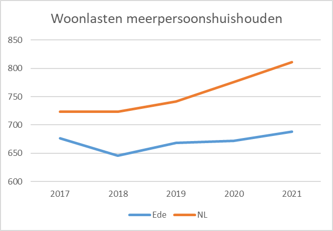 In algemene zin zien we dat de woonlasten landelijk gemiddeld hoger zijn dan de woonlasten voor de inwoner van Ede. De afgelopen jaren stegen de landelijke lasten sterker dan in Ede. De woonlasten voor een gemiddeld meerpersoonshuishouden in Ede stegen in 2021 met 1,6%. Dit wordt voornamelijk veroorzaakt door de toegepaste inflatiecorrectie.