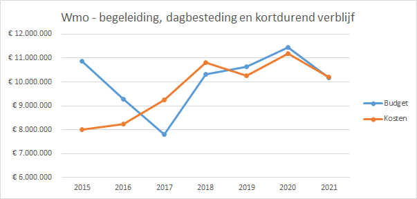 Als we de kosten van begeleiding, dagbesteding en kortdurend verblijf 'zuiver' op het jaar zetten (bijvoorbeeld kosten van 2020, die in 2021 betaald zijn, tellen we op het jaar 2020 etc.), ontstaat het volgende beeld: